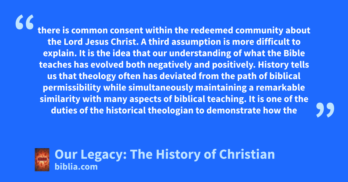 there is common consent within the redeemed community about the Lord Jesus Christ. A third assumption is more difficult to explain. It is the idea that our understanding of what the Bible teaches has evolved both negatively and positively. History tells us that theology often has deviated from the path of biblical permissibility while simultaneously maintaining a remarkable similarity with many aspects of biblical teaching. It is one of the duties of the historical theologian to demonstrate how the