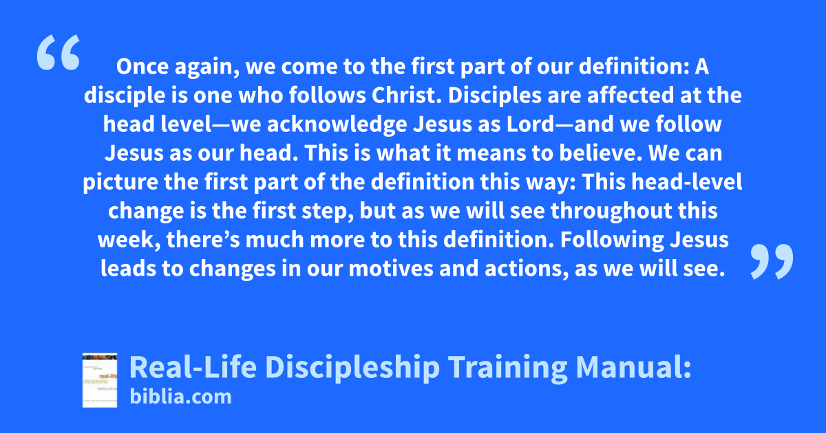 Once again, we come to the first part of our definition: A disciple is one who follows Christ. Disciples are affected at the head level—we acknowledge Jesus as Lord—and we follow Jesus as our head. This is what it means to believe. We can picture the first part of the definition this way: This head-level change is the first step, but as we will see throughout this week, there’s much more to this definition. Following Jesus leads to changes in our motives and actions, as we will see.