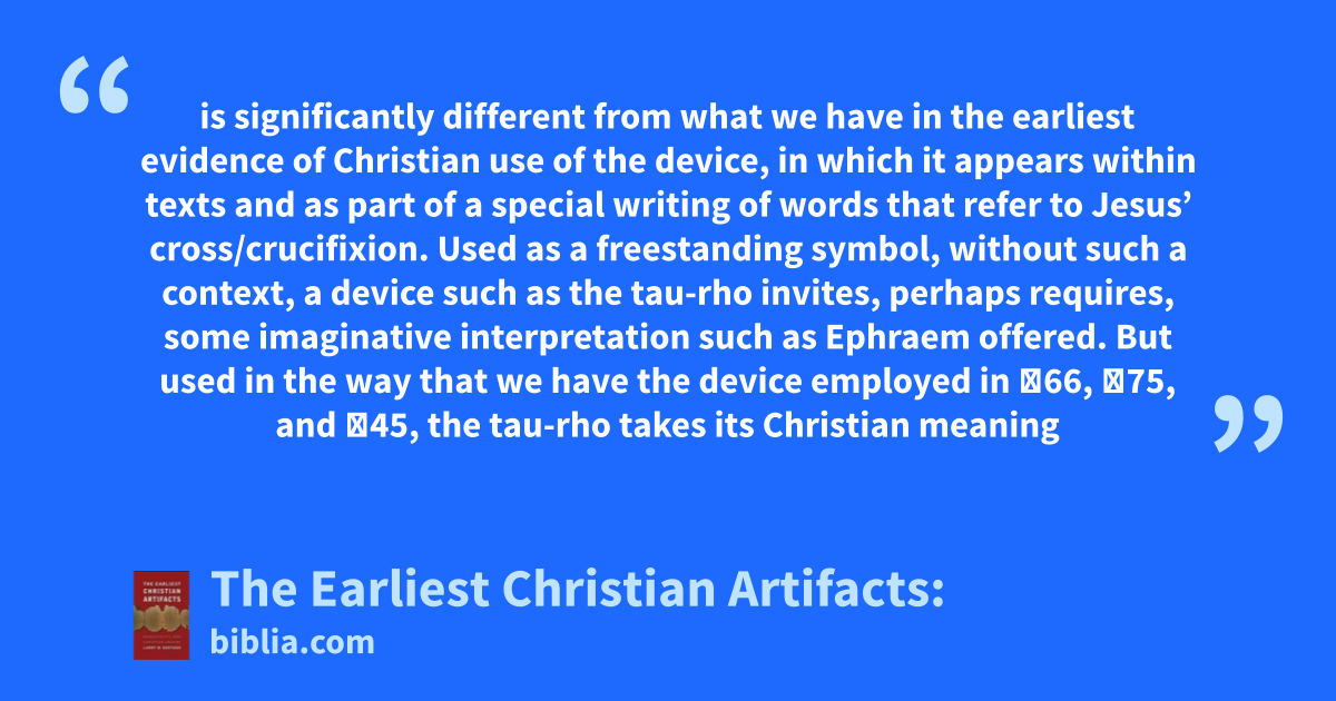 is significantly different from what we have in the earliest evidence of Christian use of the device, in which it appears within texts and as part of a special writing of words that refer to Jesus’ cross/crucifixion. Used as a freestanding symbol, without such a context, a device such as the tau-rho invites, perhaps requires, some imaginative interpretation such as Ephraem offered. But used in the way that we have the device employed in 𝔓66, 𝔓75, and 𝔓45, the tau-rho takes its Christian meaning