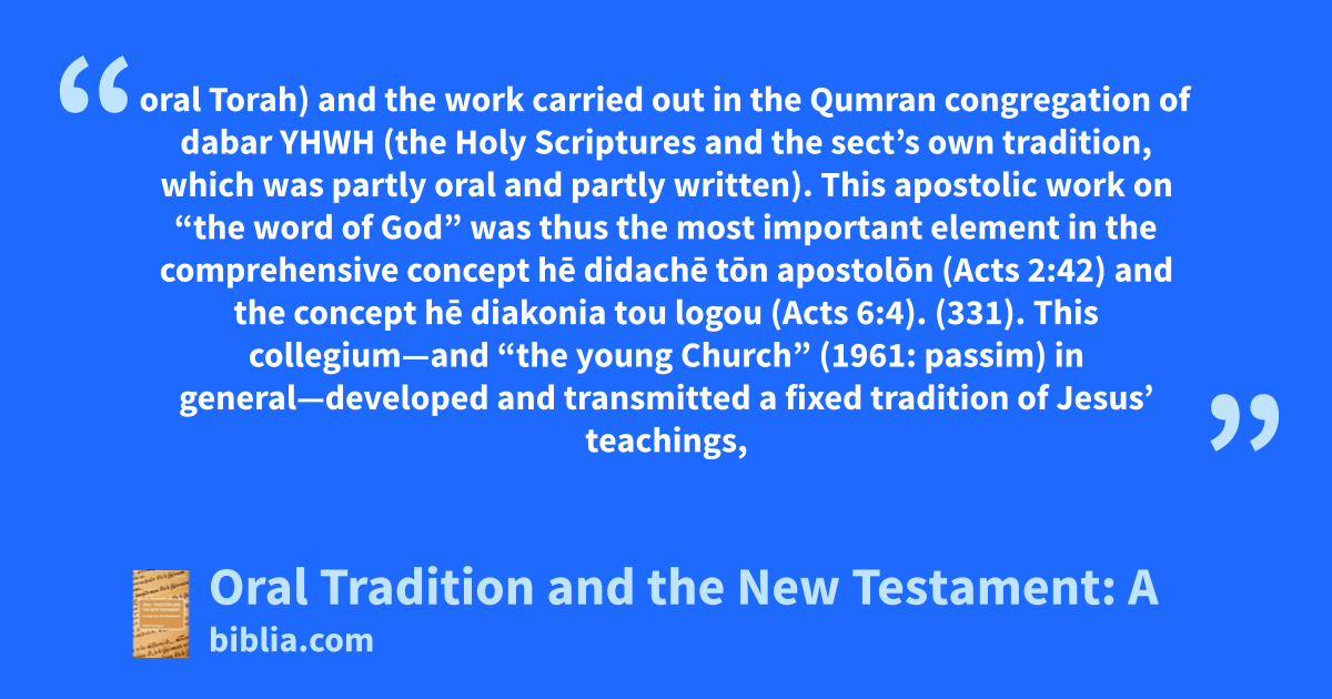 oral Torah) and the work carried out in the Qumran congregation of dabar YHWH (the Holy Scriptures and the sect’s own tradition, which was partly oral and partly written). This apostolic work on “the word of God” was thus the most important element in the comprehensive concept hē didachē tōn apostolōn (Acts 2:42) and the concept hē diakonia tou logou (Acts 6:4). (331). This collegium—and “the young Church” (1961: passim) in general—developed and transmitted a fixed tradition of Jesus’ teachings,
