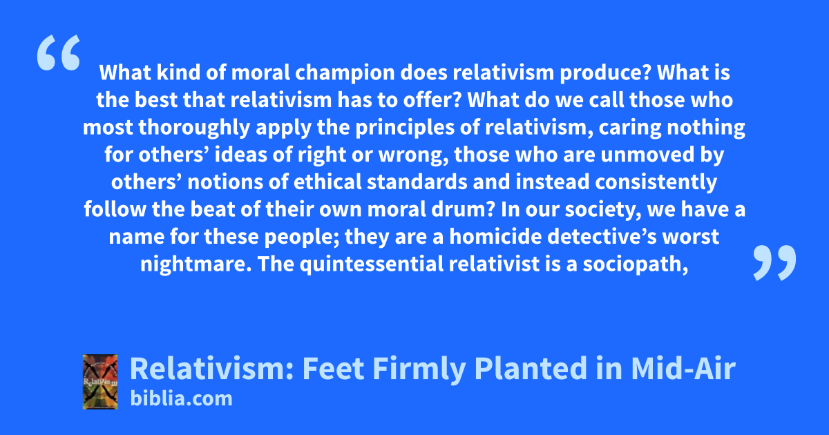 What kind of moral champion does relativism produce? What is the best that relativism has to offer? What do we call those who most thoroughly apply the principles of relativism, caring nothing for others’ ideas of right or wrong, those who are unmoved by others’ notions of ethical standards and instead consistently follow the beat of their own moral drum? In our society, we have a name for these people; they are a homicide detective’s worst nightmare. The quintessential relativist is a sociopath,
