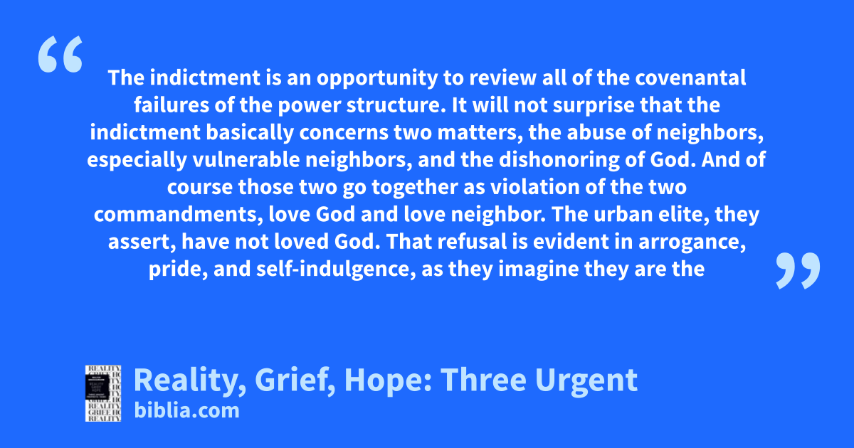 The indictment is an opportunity to review all of the covenantal failures of the power structure. It will not surprise that the indictment basically concerns two matters, the abuse of neighbors, especially vulnerable neighbors, and the dishonoring of God. And of course those two go together as violation of the two commandments, love God and love neighbor. The urban elite, they assert, have not loved God. That refusal is evident in arrogance, pride, and self-indulgence, as they imagine they are the