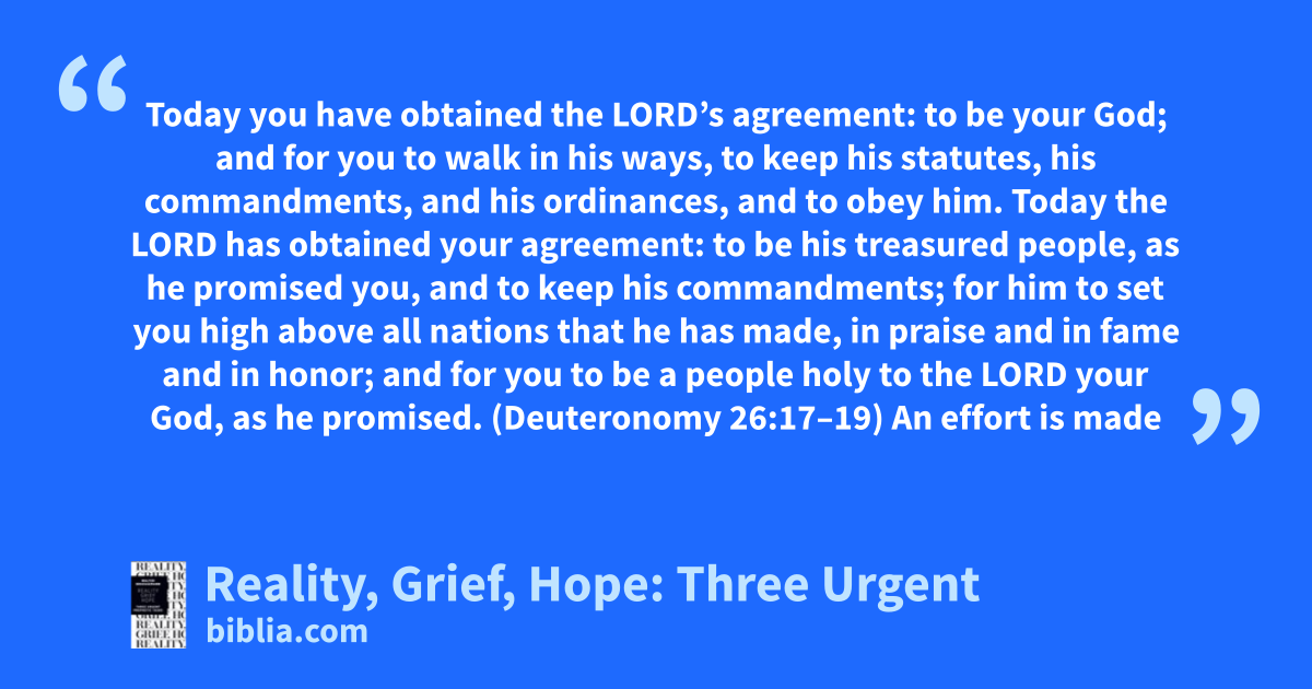 Today you have obtained the LORD’s agreement: to be your God; and for you to walk in his ways, to keep his statutes, his commandments, and his ordinances, and to obey him. Today the LORD has obtained your agreement: to be his treasured people, as he promised you, and to keep his commandments; for him to set you high above all nations that he has made, in praise and in fame and in honor; and for you to be a people holy to the LORD your God, as he promised. (Deuteronomy 26:17–19) An effort is made