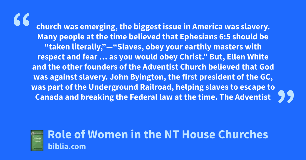 church was emerging, the biggest issue in America was slavery. Many people at the time believed that Ephesians 6:5 should be “taken literally,”—“Slaves, obey your earthly masters with respect and fear … as you would obey Christ.” But, Ellen White and the other founders of the Adventist Church believed that God was against slavery. John Byington, the first president of the GC, was part of the Underground Railroad, helping slaves to escape to Canada and breaking the Federal law at the time. The Adventist