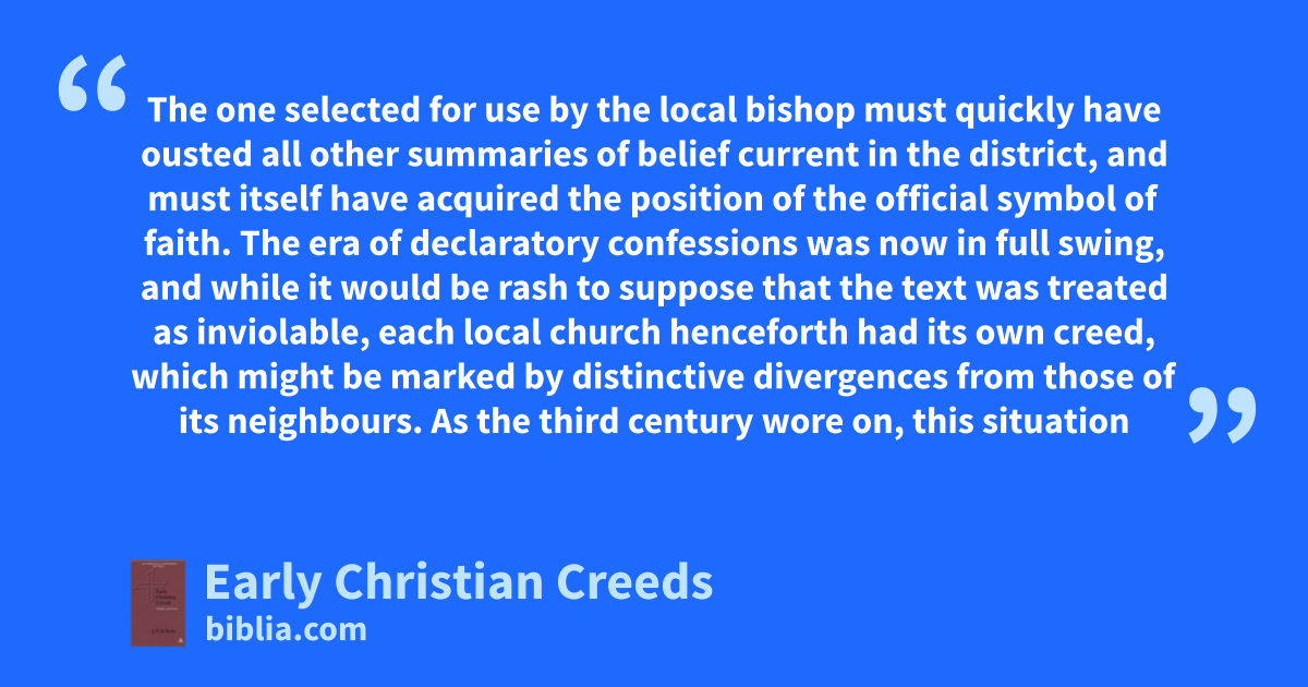 The one selected for use by the local bishop must quickly have ousted all other summaries of belief current in the district, and must itself have acquired the position of the official symbol of faith. The era of declaratory confessions was now in full swing, and while it would be rash to suppose that the text was treated as inviolable, each local church henceforth had its own creed, which might be marked by distinctive divergences from those of its neighbours. As the third century wore on, this situation