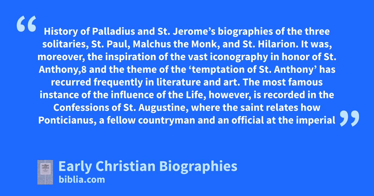 History of Palladius and St. Jerome’s biographies of the three solitaries, St. Paul, Malchus the Monk, and St. Hilarion. It was, moreover, the inspiration of the vast iconography in honor of St. Anthony,8 and the theme of the ‘temptation of St. Anthony’ has recurred frequently in literature and art. The most famous instance of the influence of the Life, however, is recorded in the Confessions of St. Augustine, where the saint relates how Ponticianus, a fellow countryman and an official at the imperial