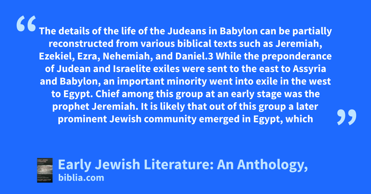 The details of the life of the Judeans in Babylon can be partially reconstructed from various biblical texts such as Jeremiah, Ezekiel, Ezra, Nehemiah, and Daniel.3 While the preponderance of Judean and Israelite exiles were sent to the east to Assyria and Babylon, an important minority went into exile in the west to Egypt. Chief among this group at an early stage was the prophet Jeremiah. It is likely that out of this group a later prominent Jewish community emerged in Egypt, which