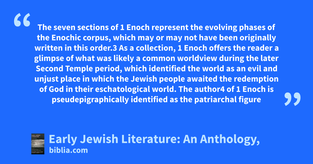 The seven sections of 1 Enoch represent the evolving phases of the Enochic corpus, which may or may not have been originally written in this order.3 As a collection, 1 Enoch offers the reader a glimpse of what was likely a common worldview during the later Second Temple period, which identified the world as an evil and unjust place in which the Jewish people awaited the redemption of God in their eschatological world. The author4 of 1 Enoch is pseudepigraphically identified as the patriarchal figure