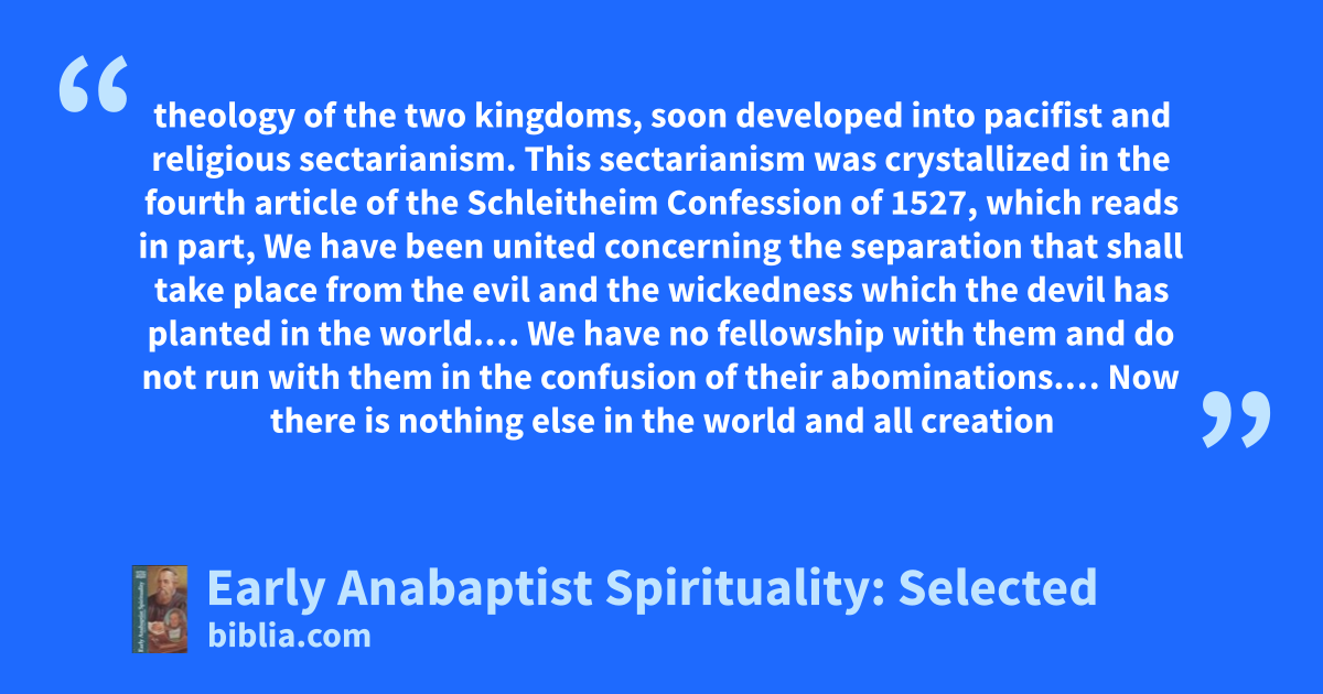 theology of the two kingdoms, soon developed into pacifist and religious sectarianism. This sectarianism was crystallized in the fourth article of the Schleitheim Confession of 1527, which reads in part, We have been united concerning the separation that shall take place from the evil and the wickedness which the devil has planted in the world.… We have no fellowship with them and do not run with them in the confusion of their abominations.… Now there is nothing else in the world and all creation