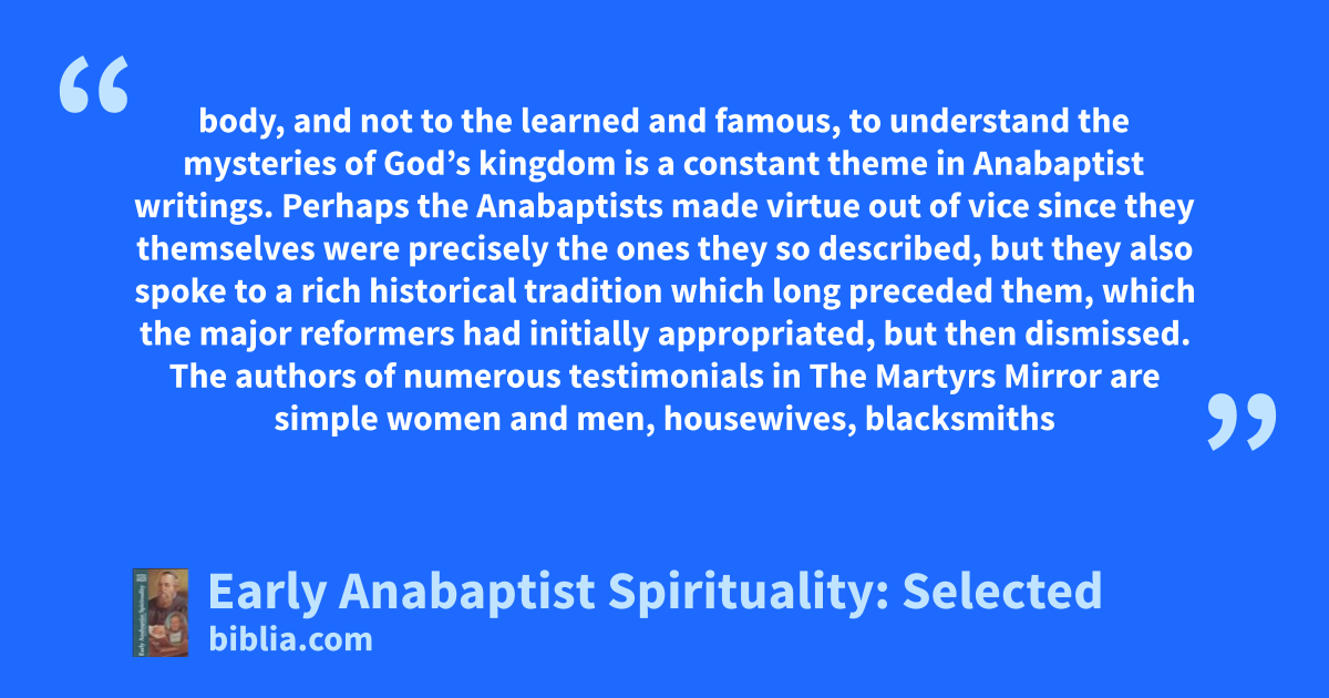 This volume consists of an anthology of early to mid-sixteenth-century writings that illuminate the distinctive character of early Anabaptist ideology. The writings focus on the themes of regeneration, the Anabaptist fellowship and the demands of discipleship.
