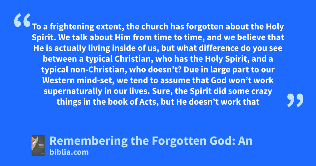 To a frightening extent, the church has forgotten about the Holy Spirit. We talk about Him from time to time, and we believe that He is actually living inside of us, but what difference do you see between a typical Christian, who has the Holy Spirit, and a typical non-Christian, who doesn’t? Due in large part to our Western mind-set, we tend to assume that God won’t work supernaturally in our lives. Sure, the Spirit did some crazy things in the book of Acts, but He doesn’t work that