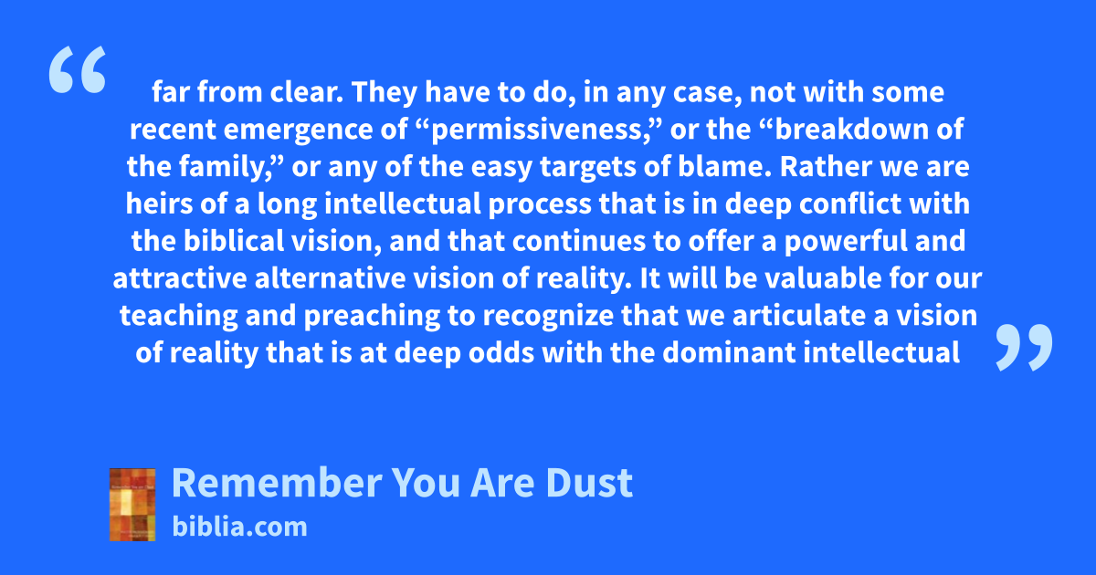 far from clear. They have to do, in any case, not with some recent emergence of “permissiveness,” or the “breakdown of the family,” or any of the easy targets of blame. Rather we are heirs of a long intellectual process that is in deep conflict with the biblical vision, and that continues to offer a powerful and attractive alternative vision of reality. It will be valuable for our teaching and preaching to recognize that we articulate a vision of reality that is at deep odds with the dominant intellectual