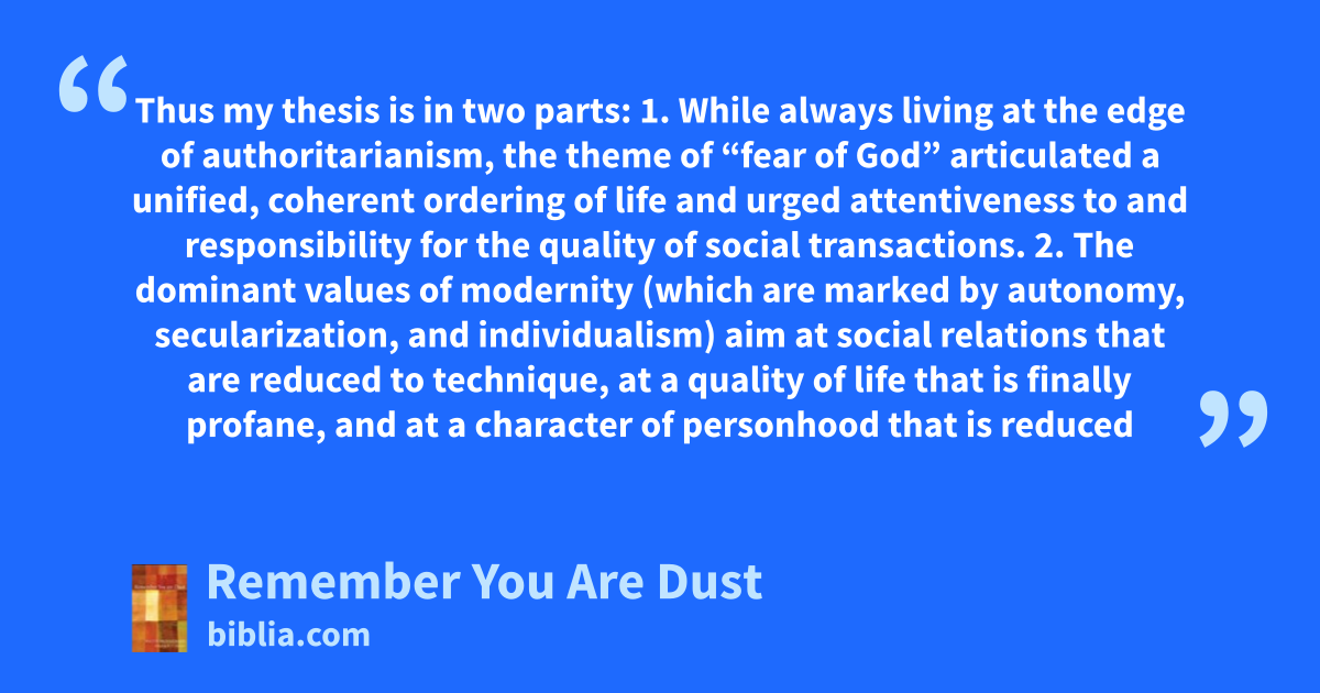 Thus my thesis is in two parts: 1. While always living at the edge of authoritarianism, the theme of “fear of God” articulated a unified, coherent ordering of life and urged attentiveness to and responsibility for the quality of social transactions. 2. The dominant values of modernity (which are marked by autonomy, secularization, and individualism) aim at social relations that are reduced to technique, at a quality of life that is finally profane, and at a character of personhood that is reduced