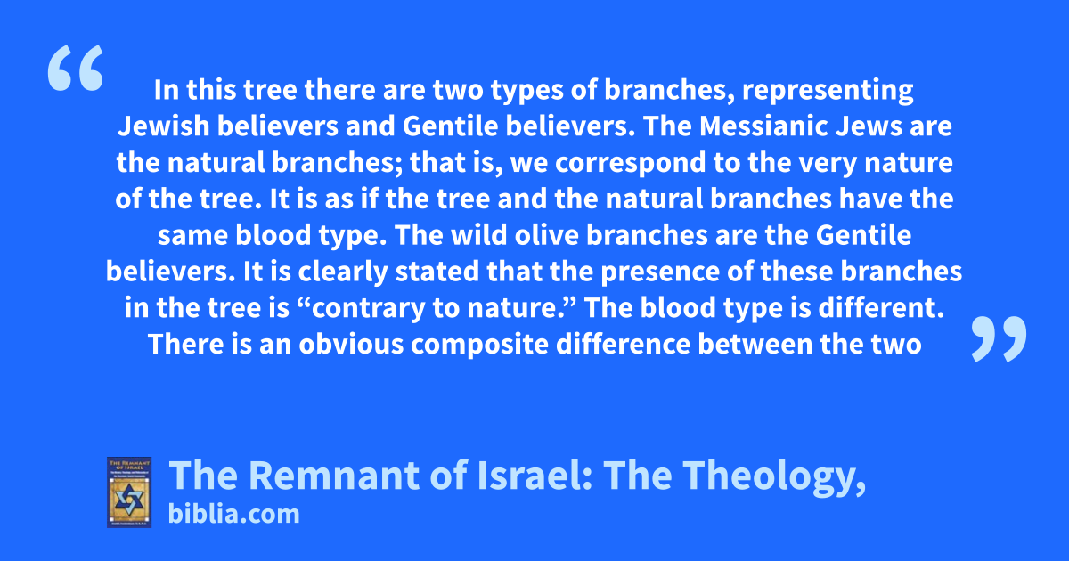 In this tree there are two types of branches, representing Jewish believers and Gentile believers. The Messianic Jews are the natural branches; that is, we correspond to the very nature of the tree. It is as if the tree and the natural branches have the same blood type. The wild olive branches are the Gentile believers. It is clearly stated that the presence of these branches in the tree is “contrary to nature.” The blood type is different. There is an obvious composite difference between the two