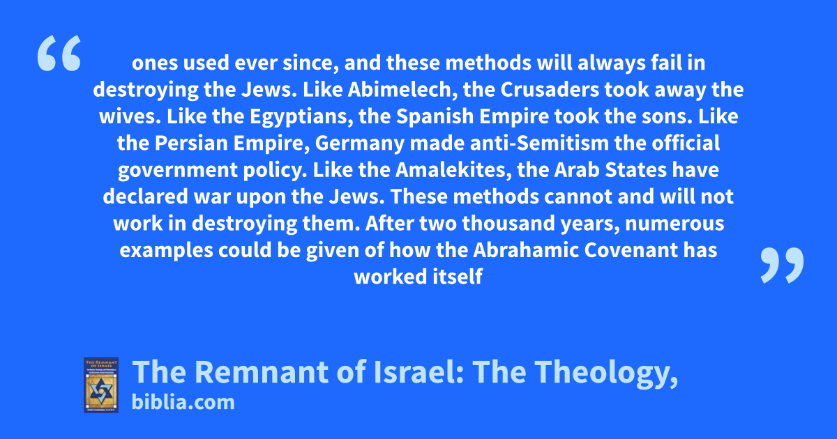 ones used ever since, and these methods will always fail in destroying the Jews. Like Abimelech, the Crusaders took away the wives. Like the Egyptians, the Spanish Empire took the sons. Like the Persian Empire, Germany made anti-Semitism the official government policy. Like the Amalekites, the Arab States have declared war upon the Jews. These methods cannot and will not work in destroying them. After two thousand years, numerous examples could be given of how the Abrahamic Covenant has worked itself