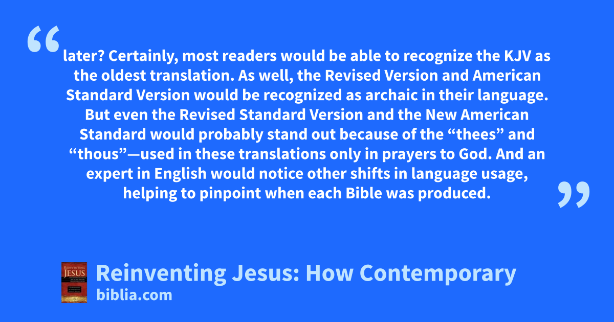later? Certainly, most readers would be able to recognize the KJV as the oldest translation. As well, the Revised Version and American Standard Version would be recognized as archaic in their language. But even the Revised Standard Version and the New American Standard would probably stand out because of the “thees” and “thous”—used in these translations only in prayers to God. And an expert in English would notice other shifts in language usage, helping to pinpoint when each Bible was produced.