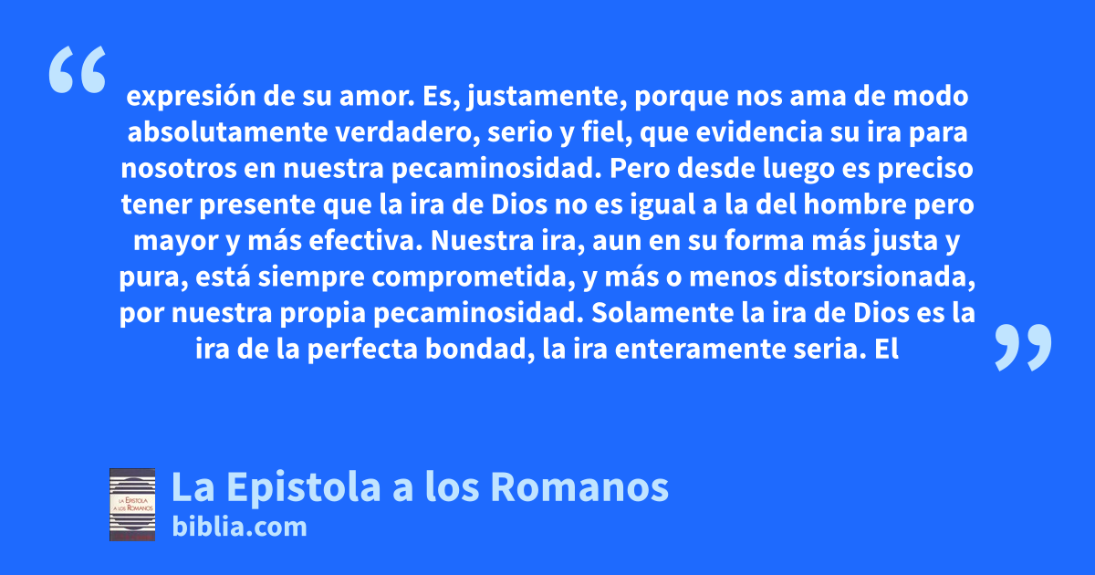 expresión de su amor. Es, justamente, porque nos ama de modo absolutamente verdadero, serio y fiel, que evidencia su ira para nosotros en nuestra pecaminosidad. Pero desde luego es preciso tener presente que la ira de Dios no es igual a la del hombre pero mayor y más efectiva. Nuestra ira, aun en su forma más justa y pura, está siempre comprometida, y más o menos distorsionada, por nuestra propia pecaminosidad. Solamente la ira de Dios es la ira de la perfecta bondad, la ira enteramente seria. El