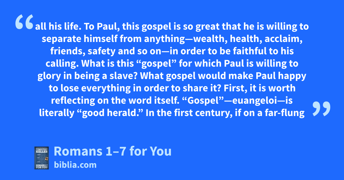 all his life. To Paul, this gospel is so great that he is willing to separate himself from anything—wealth, health, acclaim, friends, safety and so on—in order to be faithful to his calling. What is this “gospel” for which Paul is willing to glory in being a slave? What gospel would make Paul happy to lose everything in order to share it? First, it is worth reflecting on the word itself. “Gospel”—euangeloi—is literally “good herald.” In the first century, if on a far-flung
