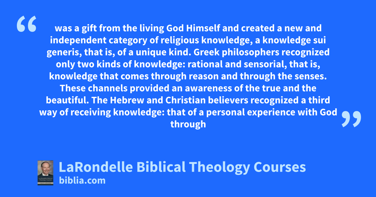 was a gift from the living God Himself and created a new and independent category of religious knowledge, a knowledge sui generis, that is, of a unique kind. Greek philosophers recognized only two kinds of knowledge: rational and sensorial, that is, knowledge that comes through reason and through the senses. These channels provided an awareness of the true and the beautiful. The Hebrew and Christian believers recognized a third way of receiving knowledge: that of a personal experience with God through