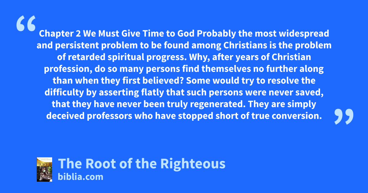 Chapter 2 We Must Give Time to God Probably the most widespread and persistent problem to be found among Christians is the problem of retarded spiritual progress. Why, after years of Christian profession, do so many persons find themselves no further along than when they first believed? Some would try to resolve the difficulty by asserting flatly that such persons were never saved, that they have never been truly regenerated. They are simply deceived professors who have stopped short of true conversion.