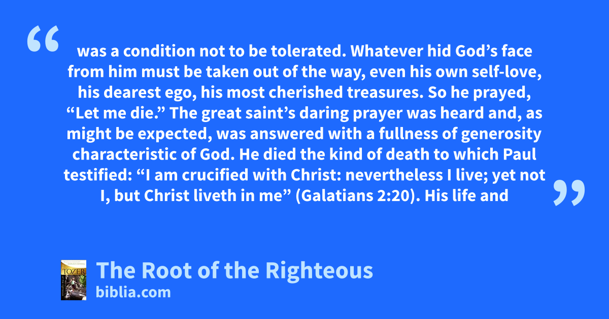was a condition not to be tolerated. Whatever hid God’s face from him must be taken out of the way, even his own self-love, his dearest ego, his most cherished treasures. So he prayed, “Let me die.” The great saint’s daring prayer was heard and, as might be expected, was answered with a fullness of generosity characteristic of God. He died the kind of death to which Paul testified: “I am crucified with Christ: nevertheless I live; yet not I, but Christ liveth in me” (Galatians 2:20). His life and