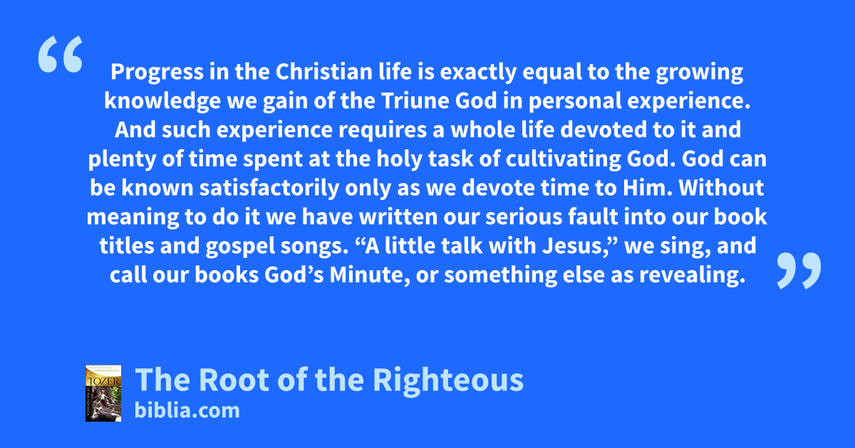 Progress in the Christian life is exactly equal to the growing knowledge we gain of the Triune God in personal experience. And such experience requires a whole life devoted to it and plenty of time spent at the holy task of cultivating God. God can be known satisfactorily only as we devote time to Him. Without meaning to do it we have written our serious fault into our book titles and gospel songs. “A little talk with Jesus,” we sing, and call our books God’s Minute, or something else as revealing.