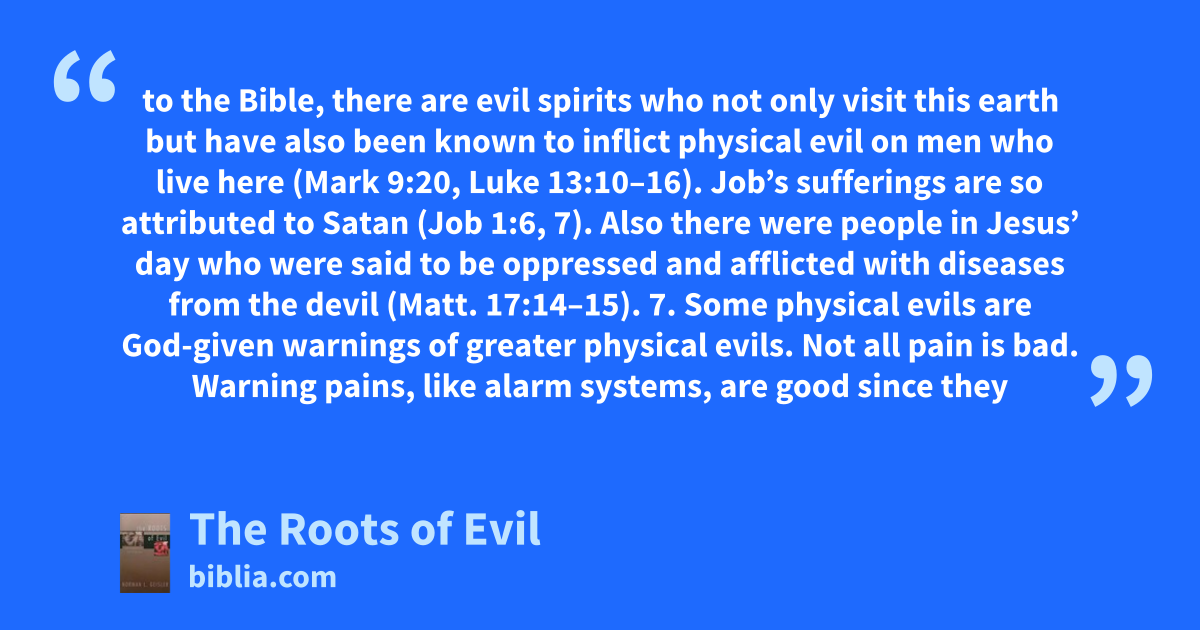 to the Bible, there are evil spirits who not only visit this earth but have also been known to inflict physical evil on men who live here (Mark 9:20, Luke 13:10–16). Job’s sufferings are so attributed to Satan (Job 1:6, 7). Also there were people in Jesus’ day who were said to be oppressed and afflicted with diseases from the devil (Matt. 17:14–15). 7. Some physical evils are God-given warnings of greater physical evils. Not all pain is bad. Warning pains, like alarm systems, are good since they