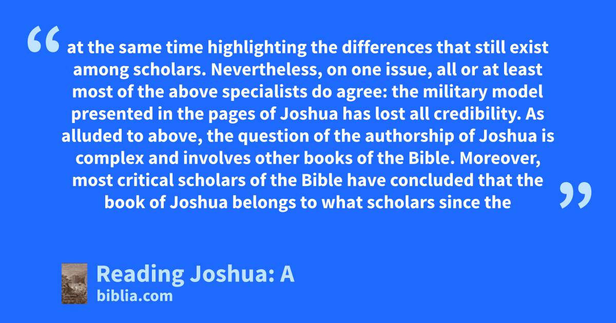 at the same time highlighting the differences that still exist among scholars. Nevertheless, on one issue, all or at least most of the above specialists do agree: the military model presented in the pages of Joshua has lost all credibility. As alluded to above, the question of the authorship of Joshua is complex and involves other books of the Bible. Moreover, most critical scholars of the Bible have concluded that the book of Joshua belongs to what scholars since the