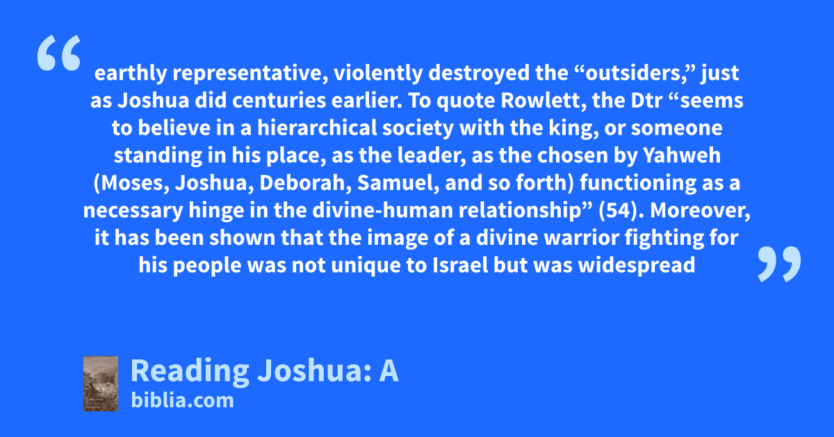 earthly representative, violently destroyed the “outsiders,” just as Joshua did centuries earlier. To quote Rowlett, the Dtr “seems to believe in a hierarchical society with the king, or someone standing in his place, as the leader, as the chosen by Yahweh (Moses, Joshua, Deborah, Samuel, and so forth) functioning as a necessary hinge in the divine-human relationship” (54). Moreover, it has been shown that the image of a divine warrior fighting for his people was not unique to Israel but was widespread