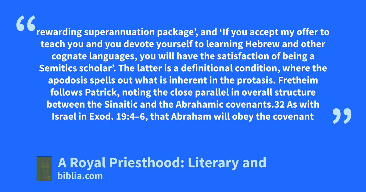 rewarding superannuation package’, and ‘If you accept my offer to teach you and you devote yourself to learning Hebrew and other cognate languages, you will have the satisfaction of being a Semitics scholar’. The latter is a definitional condition, where the apodosis spells out what is inherent in the protasis. Fretheim follows Patrick, noting the close parallel in overall structure between the Sinaitic and the Abrahamic covenants.32 As with Israel in Exod. 19:4–6, that Abraham will obey the covenant