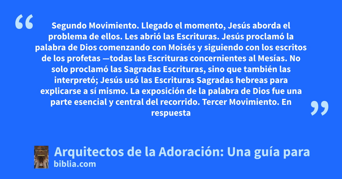 Segundo Movimiento. Llegado el momento, Jesús aborda el problema de ellos. Les abrió las Escrituras. Jesús proclamó la palabra de Dios comenzando con Moisés y siguiendo con los escritos de los profetas —todas las Escrituras concernientes al Mesías. No solo proclamó las Sagradas Escrituras, sino que también las interpretó; Jesús usó las Escrituras Sagradas hebreas para explicarse a sí mismo. La exposición de la palabra de Dios fue una parte esencial y central del recorrido. Tercer Movimiento. En respuesta