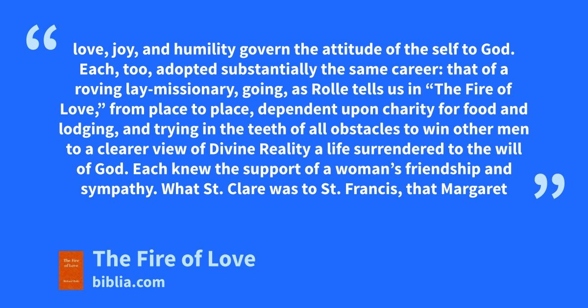 love, joy, and humility govern the attitude of the self to God. Each, too, adopted substantially the same career: that of a roving lay-missionary, going, as Rolle tells us in “The Fire of Love,” from place to place, dependent upon charity for food and lodging, and trying in the teeth of all obstacles to win other men to a clearer view of Divine Reality a life surrendered to the will of God. Each knew the support of a woman’s friendship and sympathy. What St. Clare was to St. Francis, that Margaret