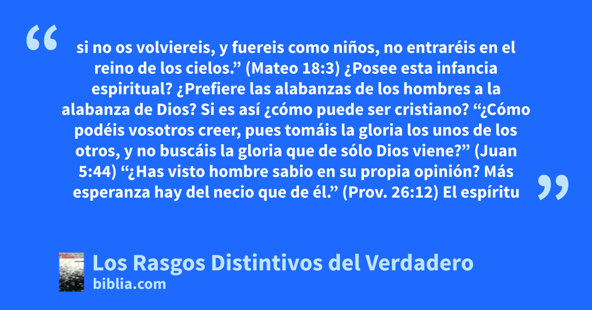 si no os volviereis, y fuereis como niños, no entraréis en el reino de los cielos.” (Mateo 18:3) ¿Posee esta infancia espiritual? ¿Prefiere las alabanzas de los hombres a la alabanza de Dios? Si es así ¿cómo puede ser cristiano? “¿Cómo podéis vosotros creer, pues tomáis la gloria los unos de los otros, y no buscáis la gloria que de sólo Dios viene?” (Juan 5:44) “¿Has visto hombre sabio en su propia opinión? Más esperanza hay del necio que de él.” (Prov. 26:12) El espíritu