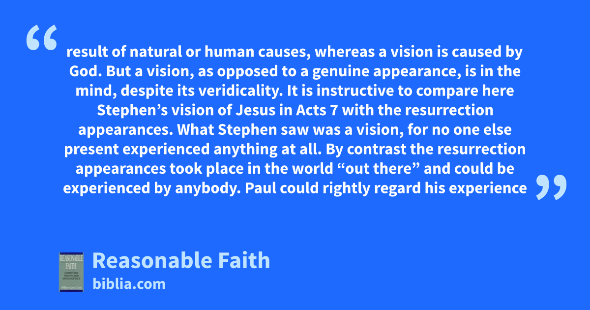 result of natural or human causes, whereas a vision is caused by God. But a vision, as opposed to a genuine appearance, is in the mind, despite its veridicality. It is instructive to compare here Stephen’s vision of Jesus in Acts 7 with the resurrection appearances. What Stephen saw was a vision, for no one else present experienced anything at all. By contrast the resurrection appearances took place in the world “out there” and could be experienced by anybody. Paul could rightly regard his experience