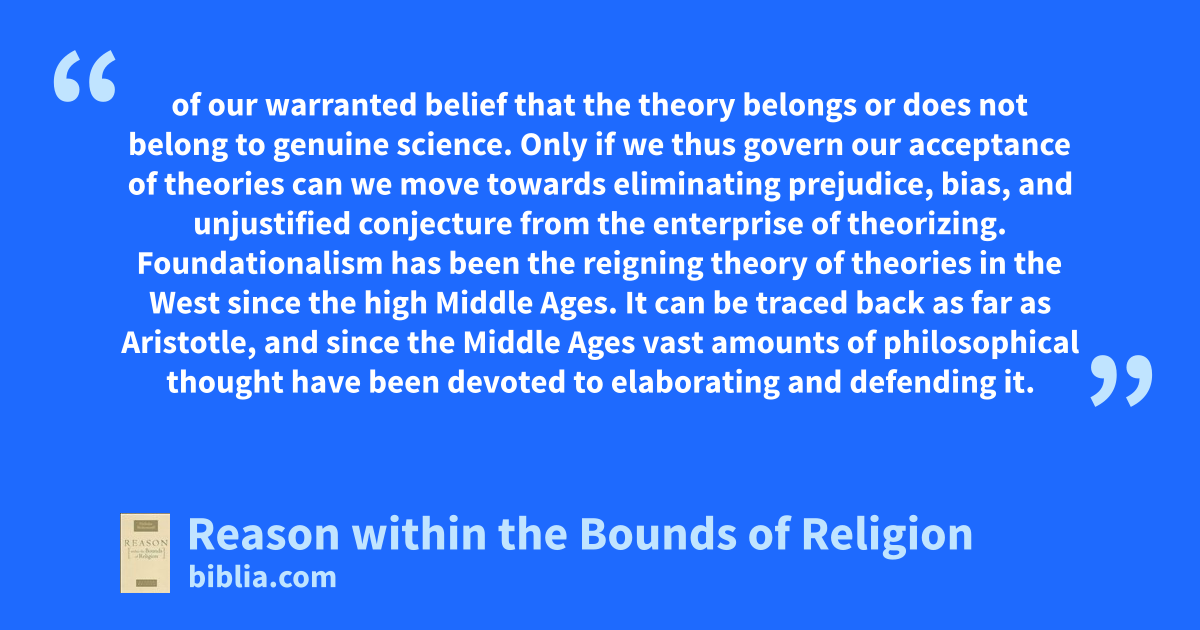 of our warranted belief that the theory belongs or does not belong to genuine science. Only if we thus govern our acceptance of theories can we move towards eliminating prejudice, bias, and unjustified conjecture from the enterprise of theorizing. Foundationalism has been the reigning theory of theories in the West since the high Middle Ages. It can be traced back as far as Aristotle, and since the Middle Ages vast amounts of philosophical thought have been devoted to elaborating and defending it.