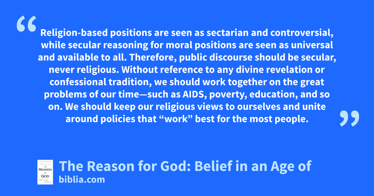 Religion-based positions are seen as sectarian and controversial, while secular reasoning for moral positions are seen as universal and available to all. Therefore, public discourse should be secular, never religious. Without reference to any divine revelation or confessional tradition, we should work together on the great problems of our time—such as AIDS, poverty, education, and so on. We should keep our religious views to ourselves and unite around policies that “work” best for the most people.
