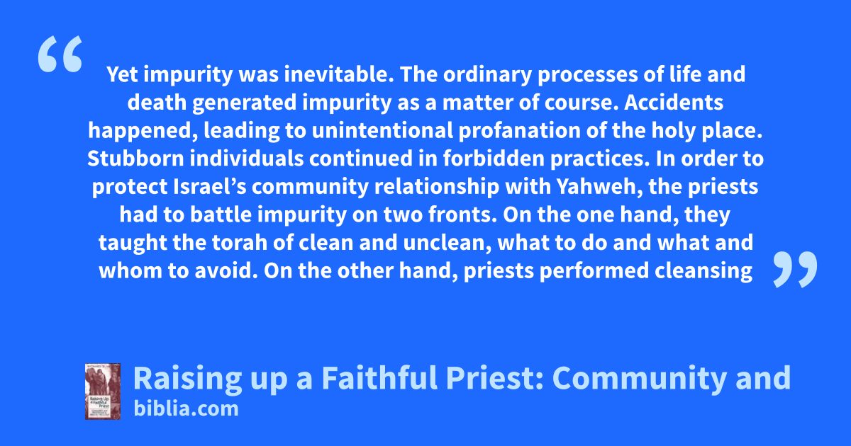 Yet impurity was inevitable. The ordinary processes of life and death generated impurity as a matter of course. Accidents happened, leading to unintentional profanation of the holy place. Stubborn individuals continued in forbidden practices. In order to protect Israel’s community relationship with Yahweh, the priests had to battle impurity on two fronts. On the one hand, they taught the torah of clean and unclean, what to do and what and whom to avoid. On the other hand, priests performed cleansing