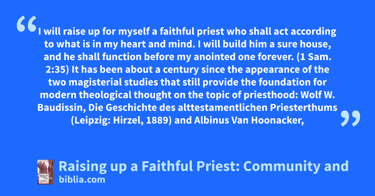 I will raise up for myself a faithful priest who shall act according to what is in my heart and mind. I will build him a sure house, and he shall function before my anointed one forever. (1 Sam. 2:35) It has been about a century since the appearance of the two magisterial studies that still provide the foundation for modern theological thought on the topic of priesthood: Wolf W. Baudissin, Die Geschichte des alttestamentlichen Priesterthums (Leipzig: Hirzel, 1889) and Albinus Van Hoonacker,