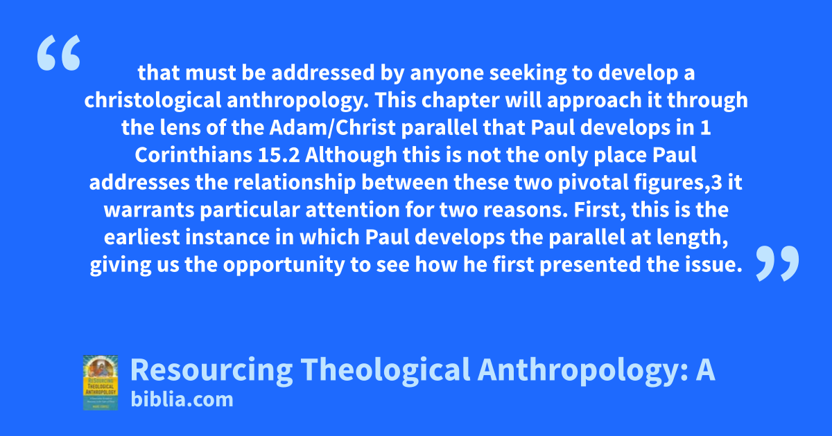 that must be addressed by anyone seeking to develop a christological anthropology. This chapter will approach it through the lens of the Adam/Christ parallel that Paul develops in 1 Corinthians 15.2 Although this is not the only place Paul addresses the relationship between these two pivotal figures,3 it warrants particular attention for two reasons. First, this is the earliest instance in which Paul develops the parallel at length, giving us the opportunity to see how he first presented the issue.