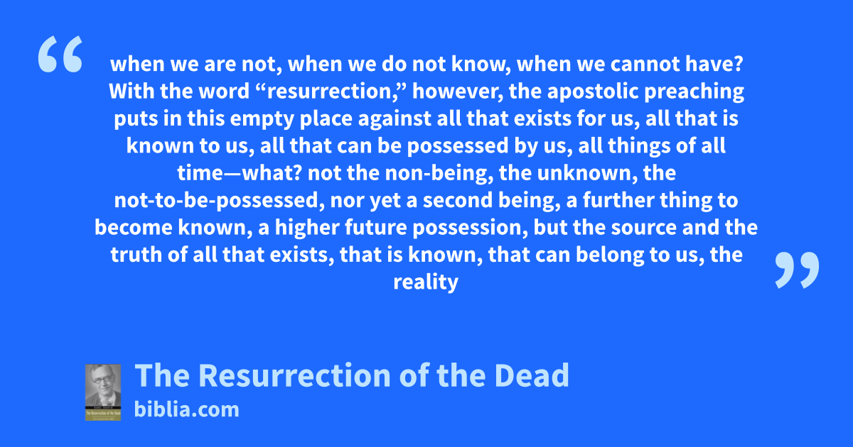 when we are not, when we do not know, when we cannot have? With the word “resurrection,” however, the apostolic preaching puts in this empty place against all that exists for us, all that is known to us, all that can be possessed by us, all things of all time—what? not the non-being, the unknown, the not-to-be-possessed, nor yet a second being, a further thing to become known, a higher future possession, but the source and the truth of all that exists, that is known, that can belong to us, the reality