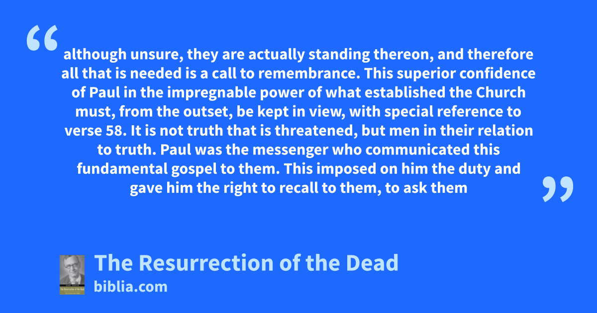 although unsure, they are actually standing thereon, and therefore all that is needed is a call to remembrance. This superior confidence of Paul in the impregnable power of what established the Church must, from the outset, be kept in view, with special reference to verse 58. It is not truth that is threatened, but men in their relation to truth. Paul was the messenger who communicated this fundamental gospel to them. This imposed on him the duty and gave him the right to recall to them, to ask them