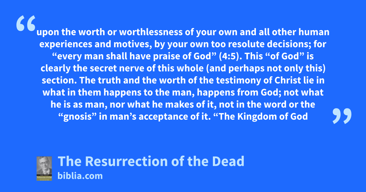 upon the worth or worthlessness of your own and all other human experiences and motives, by your own too resolute decisions; for “every man shall have praise of God” (4:5). This “of God” is clearly the secret nerve of this whole (and perhaps not only this) section. The truth and the worth of the testimony of Christ lie in what in them happens to the man, happens from God; not what he is as man, nor what he makes of it, not in the word or the “gnosis” in man’s acceptance of it. “The Kingdom of God