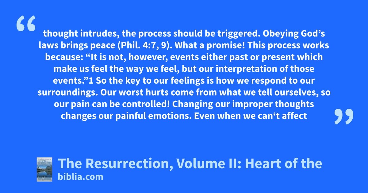 thought intrudes, the process should be triggered. Obeying God’s laws brings peace (Phil. 4:7, 9). What a promise! This process works because: “It is not, however, events either past or present which make us feel the way we feel, but our interpretation of those events.”1 So the key to our feelings is how we respond to our surroundings. Our worst hurts come from what we tell ourselves, so our pain can be controlled! Changing our improper thoughts changes our painful emotions. Even when we can‘t affect