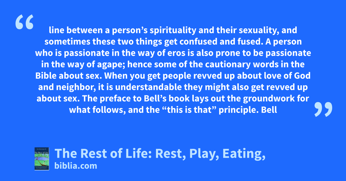 line between a person’s spirituality and their sexuality, and sometimes these two things get confused and fused. A person who is passionate in the way of eros is also prone to be passionate in the way of agape; hence some of the cautionary words in the Bible about sex. When you get people revved up about love of God and neighbor, it is understandable they might also get revved up about sex. The preface to Bell’s book lays out the groundwork for what follows, and the “this is that” principle. Bell