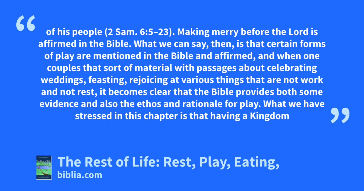 of his people (2 Sam. 6:5–23). Making merry before the Lord is affirmed in the Bible. What we can say, then, is that certain forms of play are mentioned in the Bible and affirmed, and when one couples that sort of material with passages about celebrating weddings, feasting, rejoicing at various things that are not work and not rest, it becomes clear that the Bible provides both some evidence and also the ethos and rationale for play. What we have stressed in this chapter is that having a Kingdom