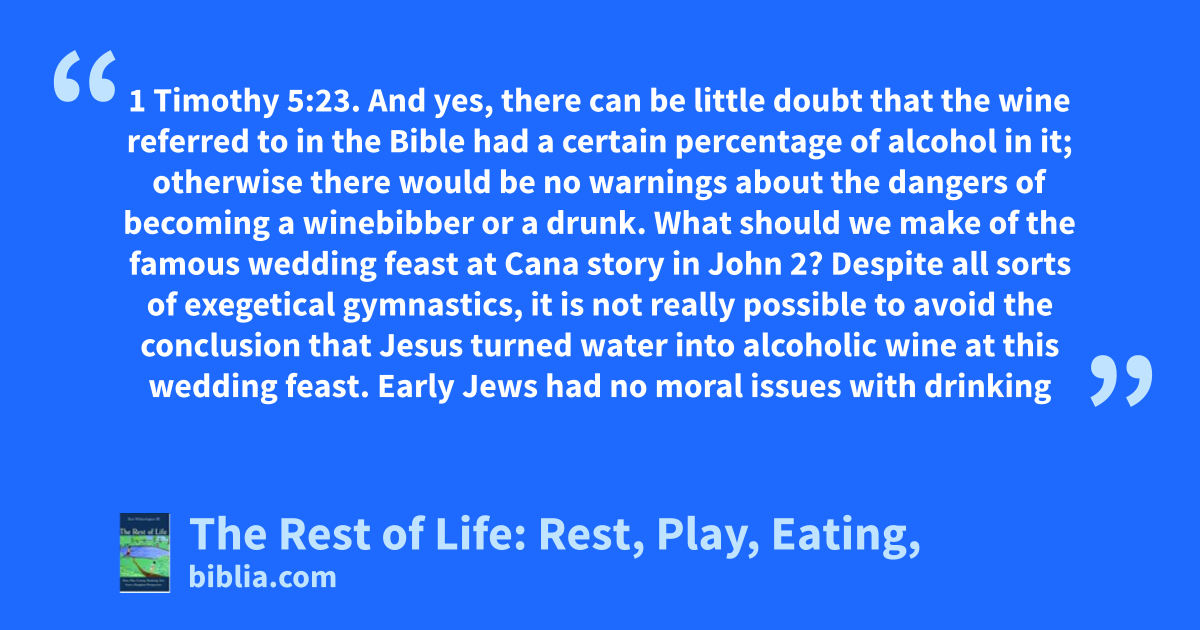1 Timothy 5:23. And yes, there can be little doubt that the wine referred to in the Bible had a certain percentage of alcohol in it; otherwise there would be no warnings about the dangers of becoming a winebibber or a drunk. What should we make of the famous wedding feast at Cana story in John 2? Despite all sorts of exegetical gymnastics, it is not really possible to avoid the conclusion that Jesus turned water into alcoholic wine at this wedding feast. Early Jews had no moral issues with drinking