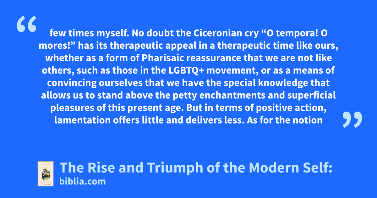 few times myself. No doubt the Ciceronian cry “O tempora! O mores!” has its therapeutic appeal in a therapeutic time like ours, whether as a form of Pharisaic reassurance that we are not like others, such as those in the LGBTQ+ movement, or as a means of convincing ourselves that we have the special knowledge that allows us to stand above the petty enchantments and superficial pleasures of this present age. But in terms of positive action, lamentation offers little and delivers less. As for the notion