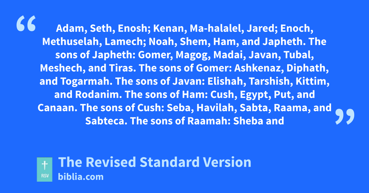 5 The sons of Japheth: Gomer, Magog, Madai, Javan, Tubal, Meshech, and Tiras. 6 The sons of Gomer: Ashkenaz, Diphath, and Togarmah. 7 The sons of Javan: Elishah, Tarshish, Kittim, and Rodanim.