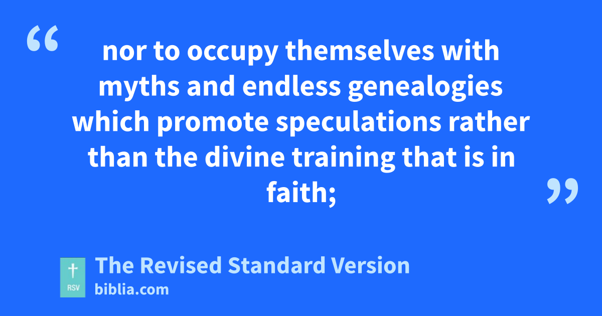 3 As I urged you when I was going to Macedonia, remain at Ephesus that you may charge certain persons not to teach any different doctrine, 4 nor to occupy themselves with myths and endless genealogies which promote speculations rather than the divine training that is in faith; 5 whereas the aim of our charge is love that issues from a pure heart and a good conscience and sincere faith. 6 Certain persons by swerving from these have wandered away into vain discussion, 7 desiring to be teachers of the law, without understanding either what they are saying or the things about which they make assertions.
