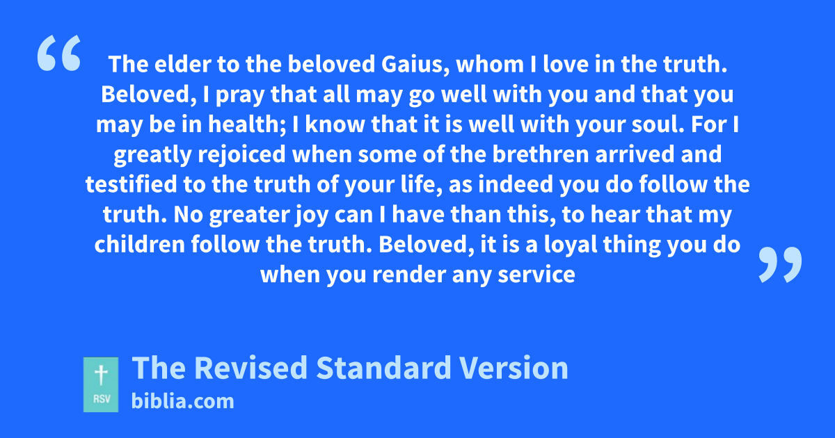 1 The elder to the beloved Gaius, whom I love in the truth. 2 Beloved, I pray that all may go well with you and that you may be in health; I know that it is well with your soul. 3 For I greatly rejoiced when some of the brethren arrived and testified to the truth of your life, as indeed you do follow the truth. 4 No greater joy can I have than this, to hear that my children follow the truth.
